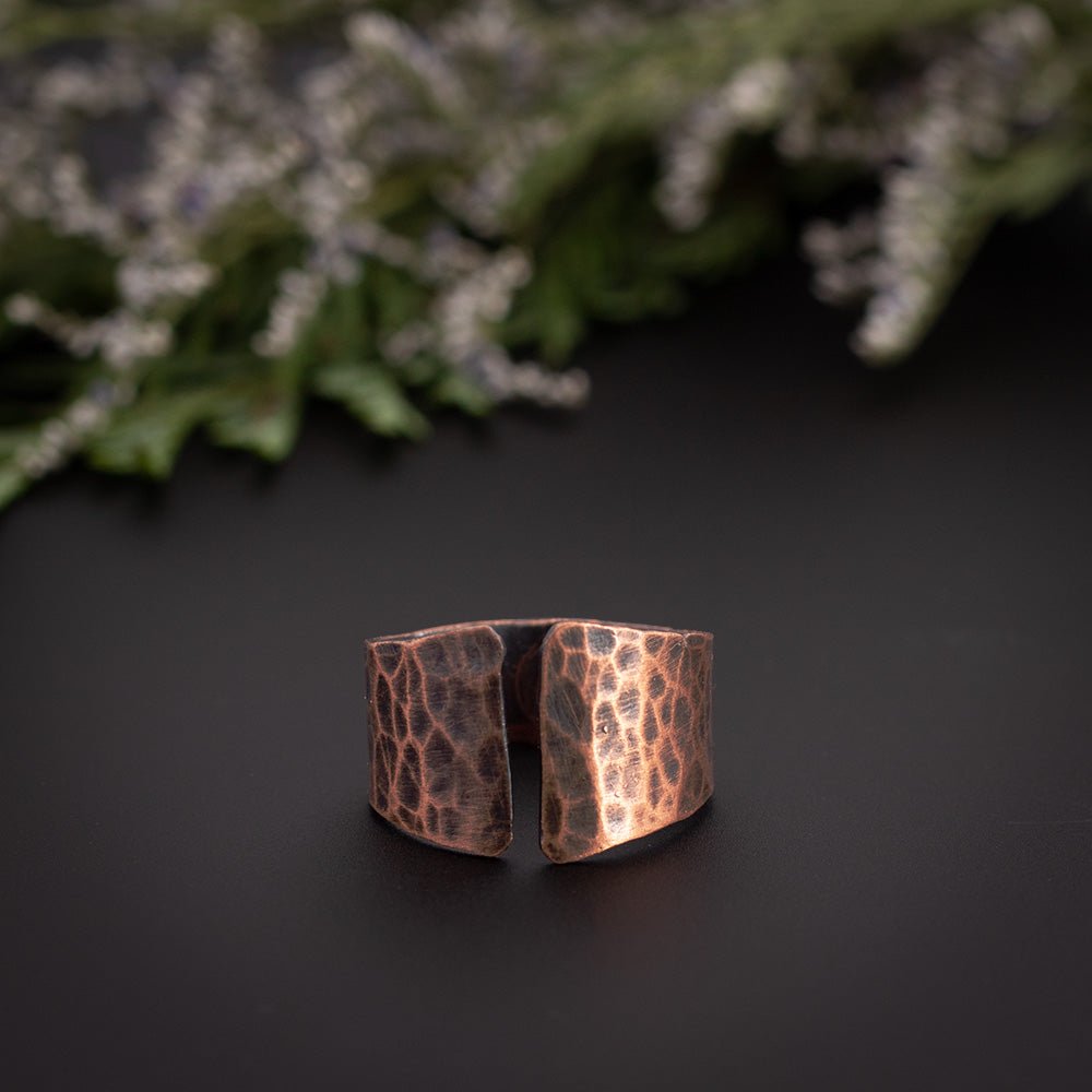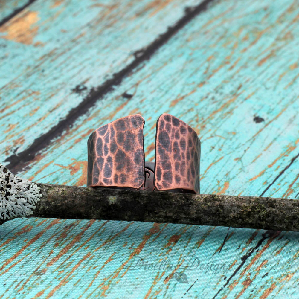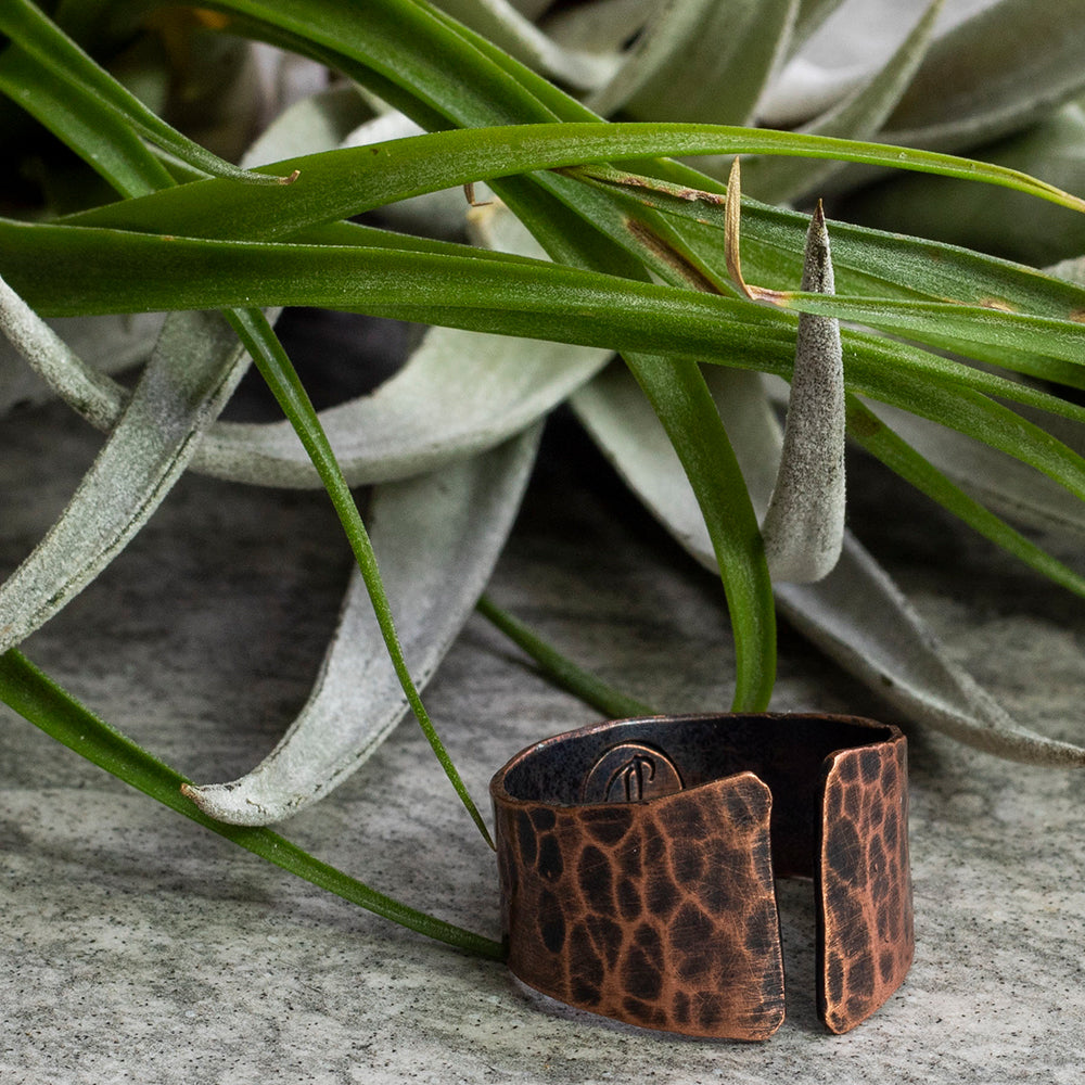 Made with pure copper, this ring is cut, textured, formed and polished prior to applying the patina. The outside is sealed to preserve the patina. Please let me know if you would like the inside sealed as well.