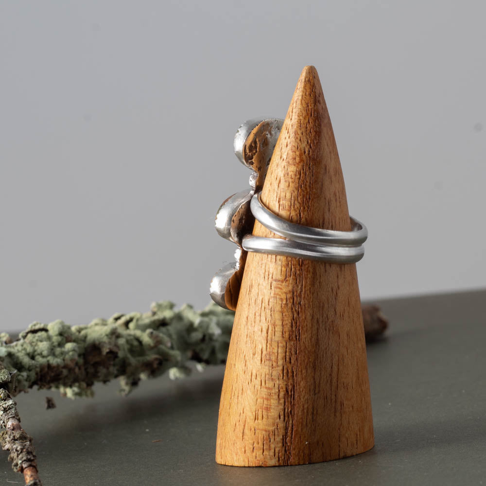 The stones are securely bezel-set in fine silver with subtle oxidized accents to highlight the depth and texture. The triple-stone design gives it height and character while still remaining comfortable for everyday wear.