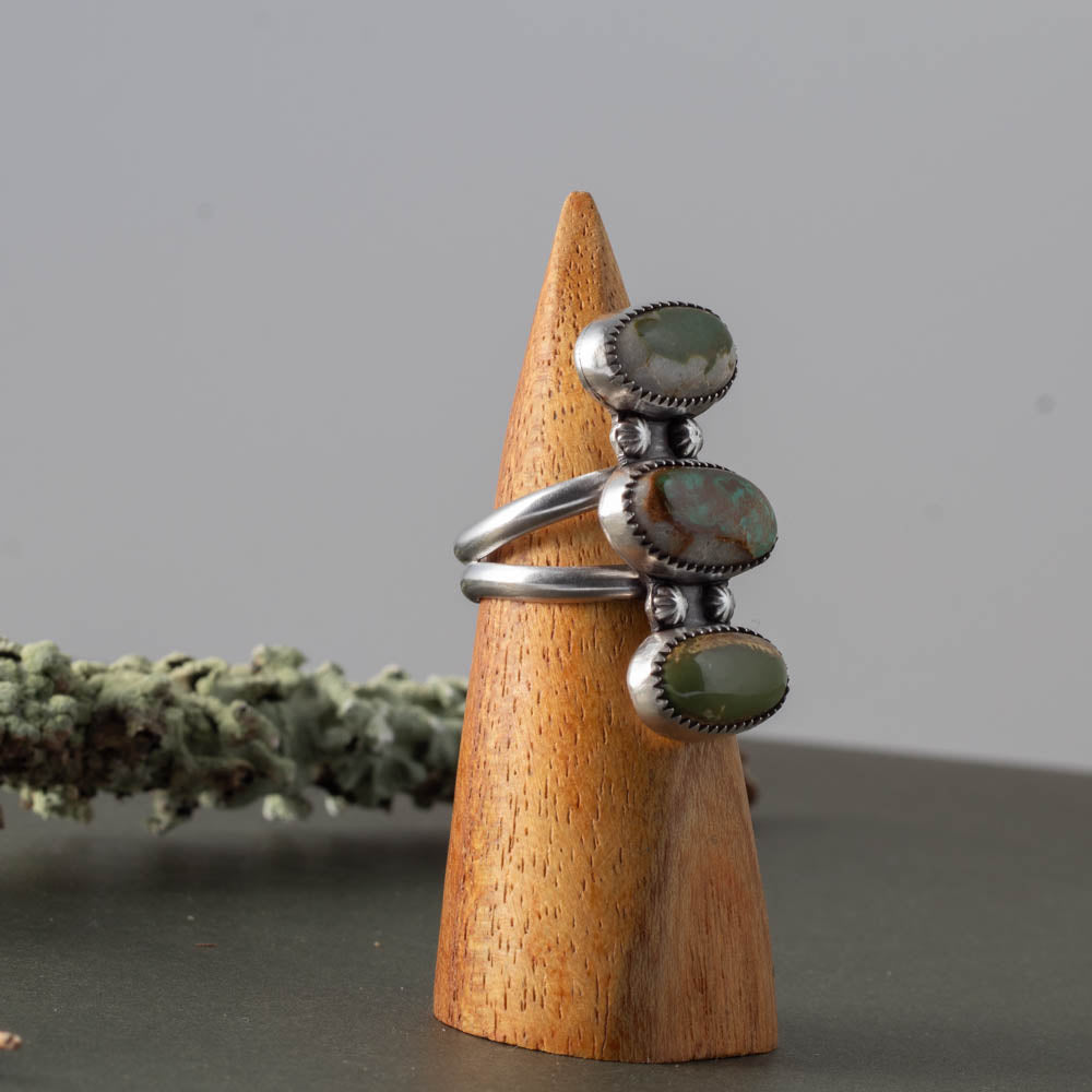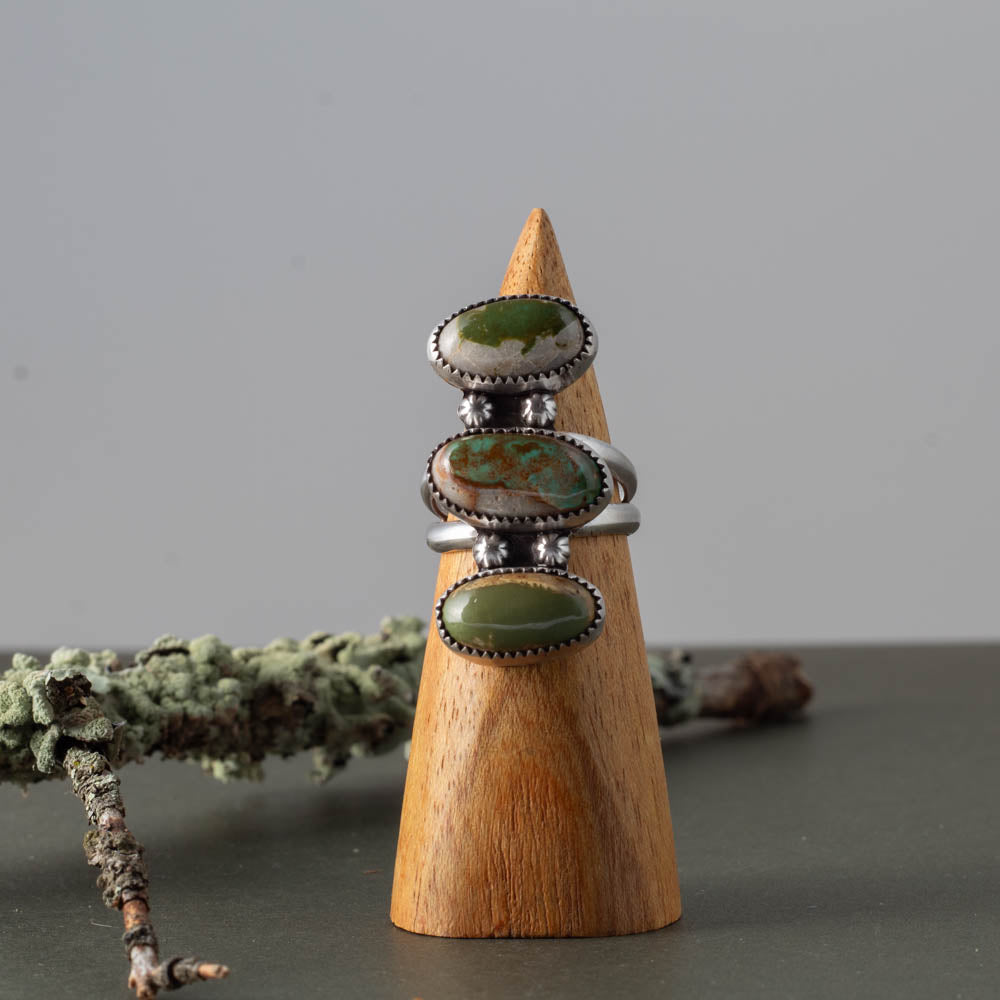 Three slices of Royston turquoise come together in this bold, landscape-inspired design — each stone carrying its own little horizon line. Soft sage green, vibrant aqua, and warm earthy matrix stack like desert ridges at sunset.